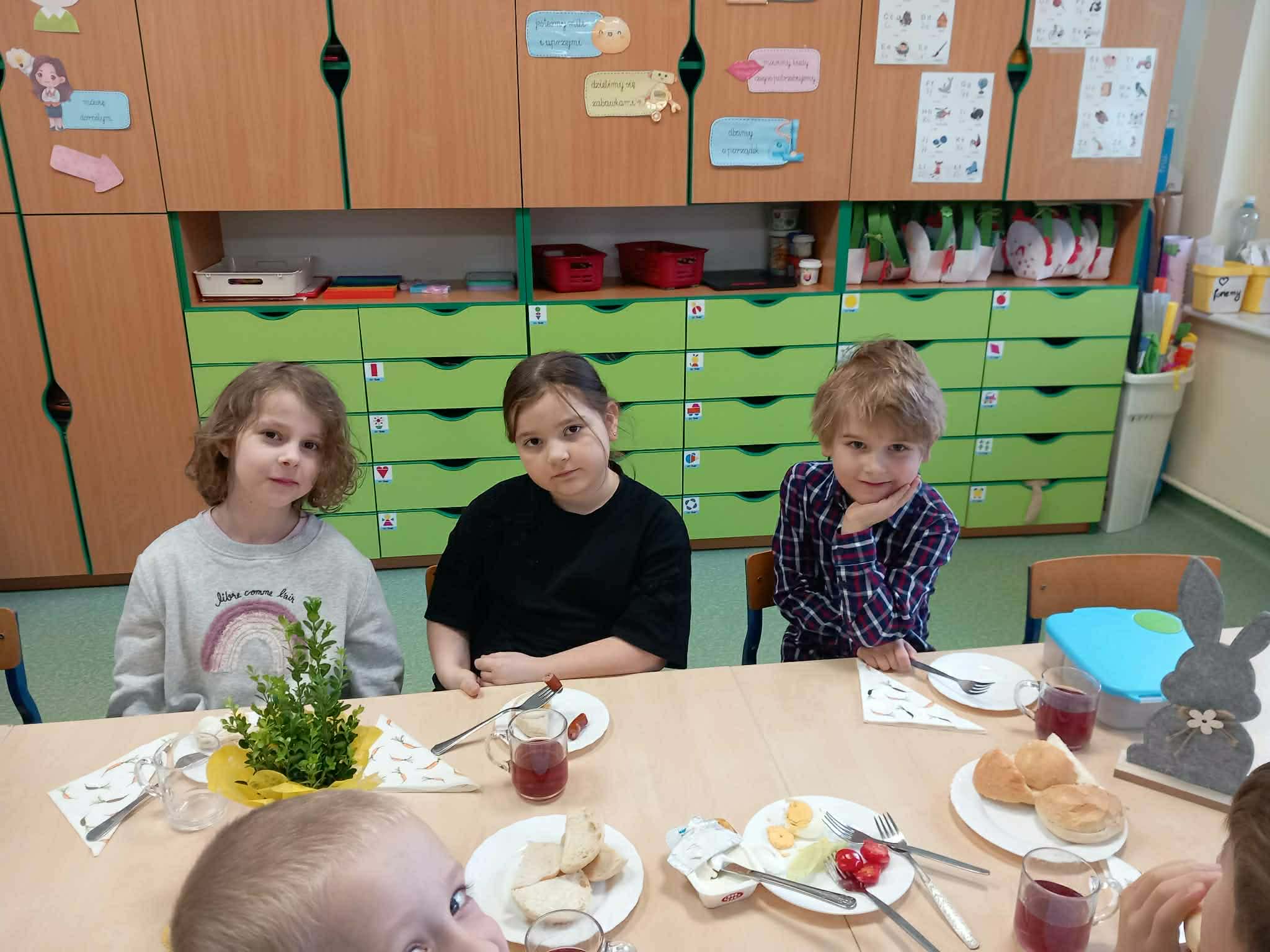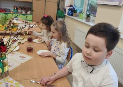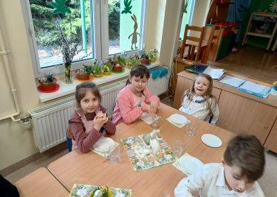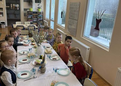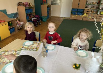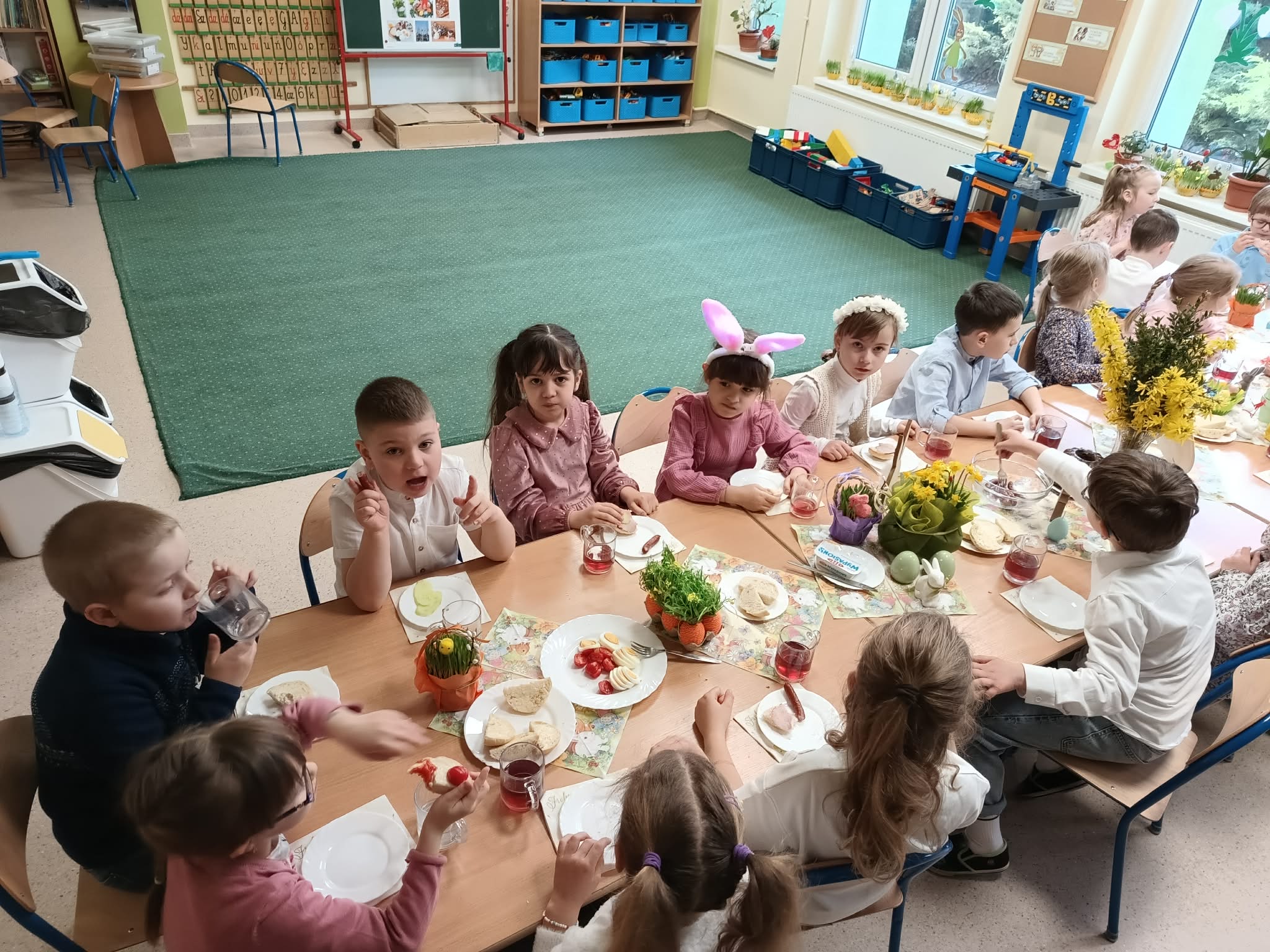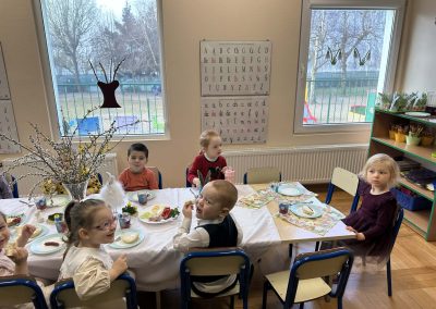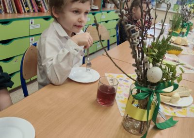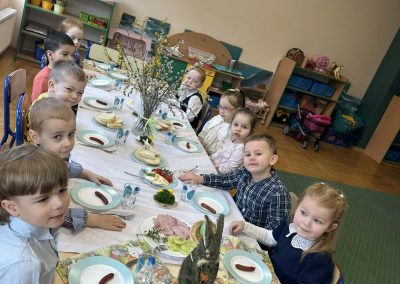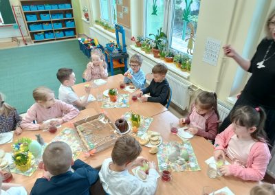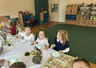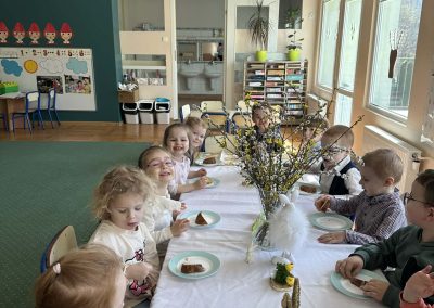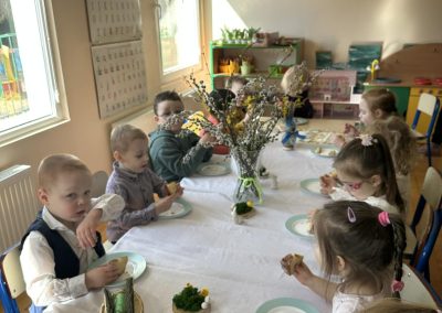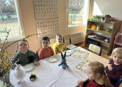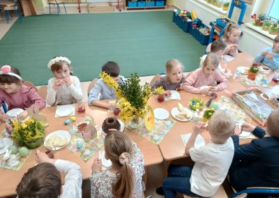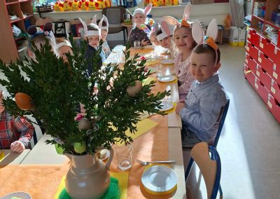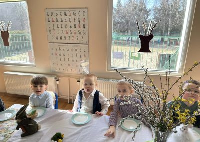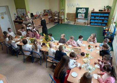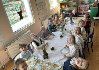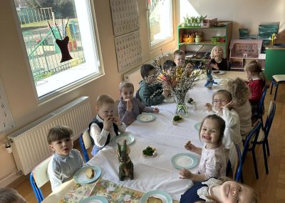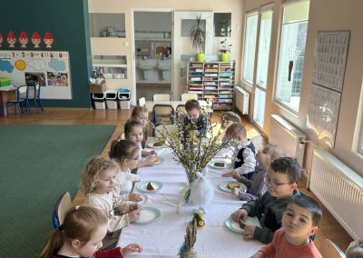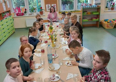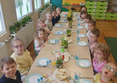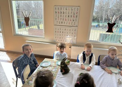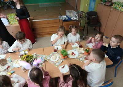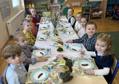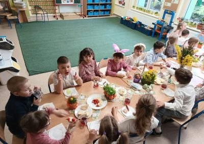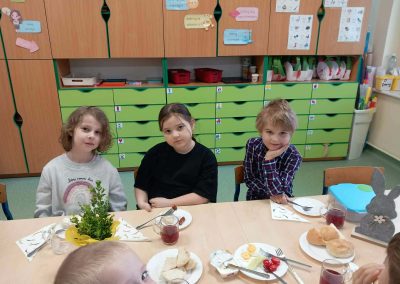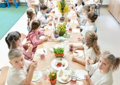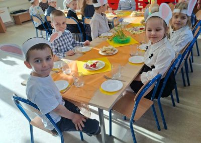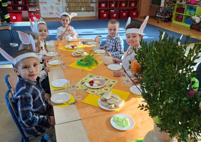 Śniadanie Wielkanocne utworzone przez d.jekel@przedszkolepobiedziska.pl | kwi 8, 2026 | Aktualności W środę, już tradycyjnie, zasiedliśmy do Śniadania Wielkanocnego. Po śniadaniu przykicali do nas goście i zostawili małe podarunki:)