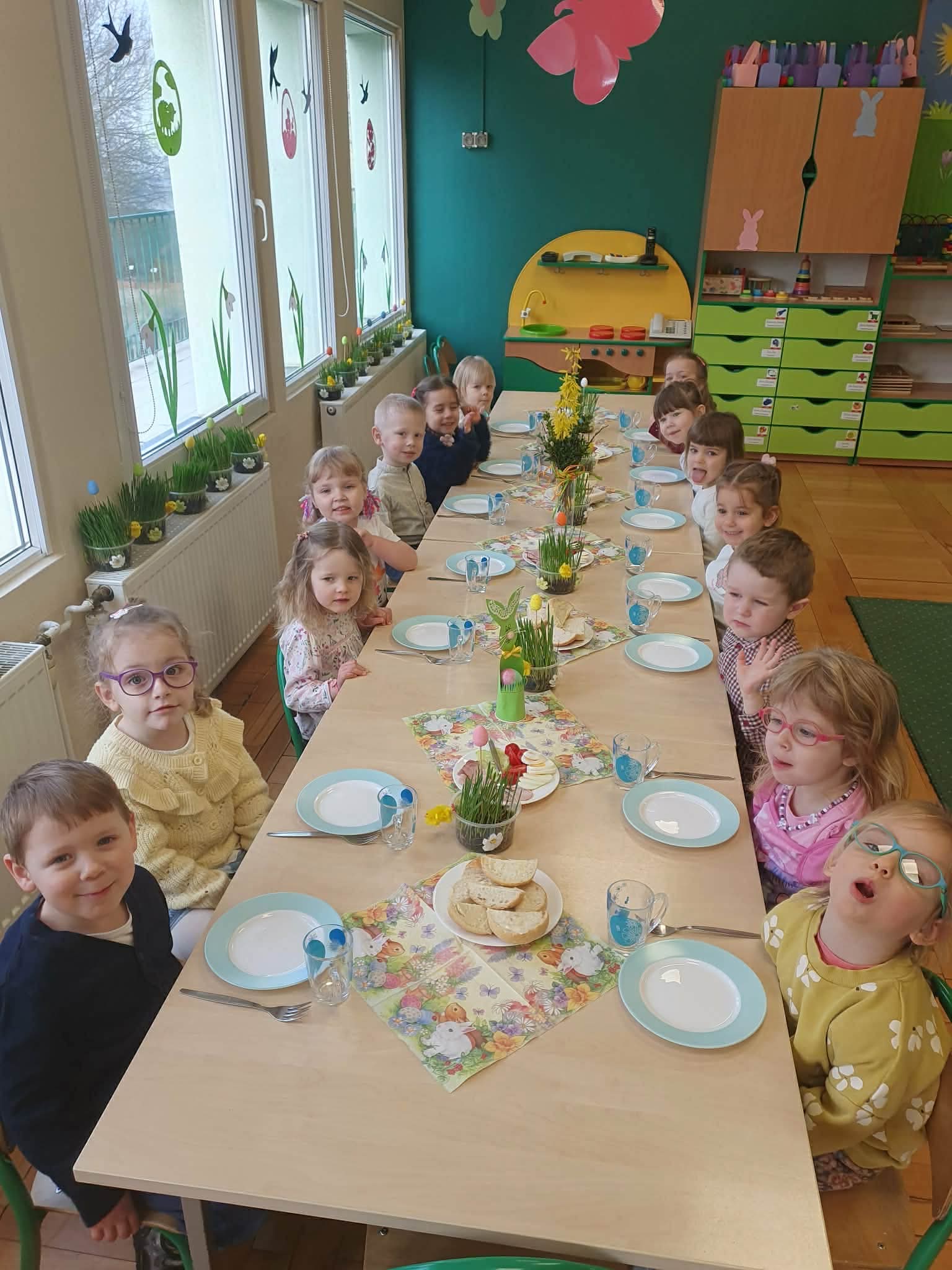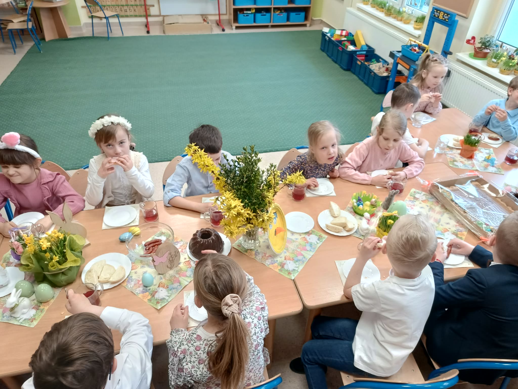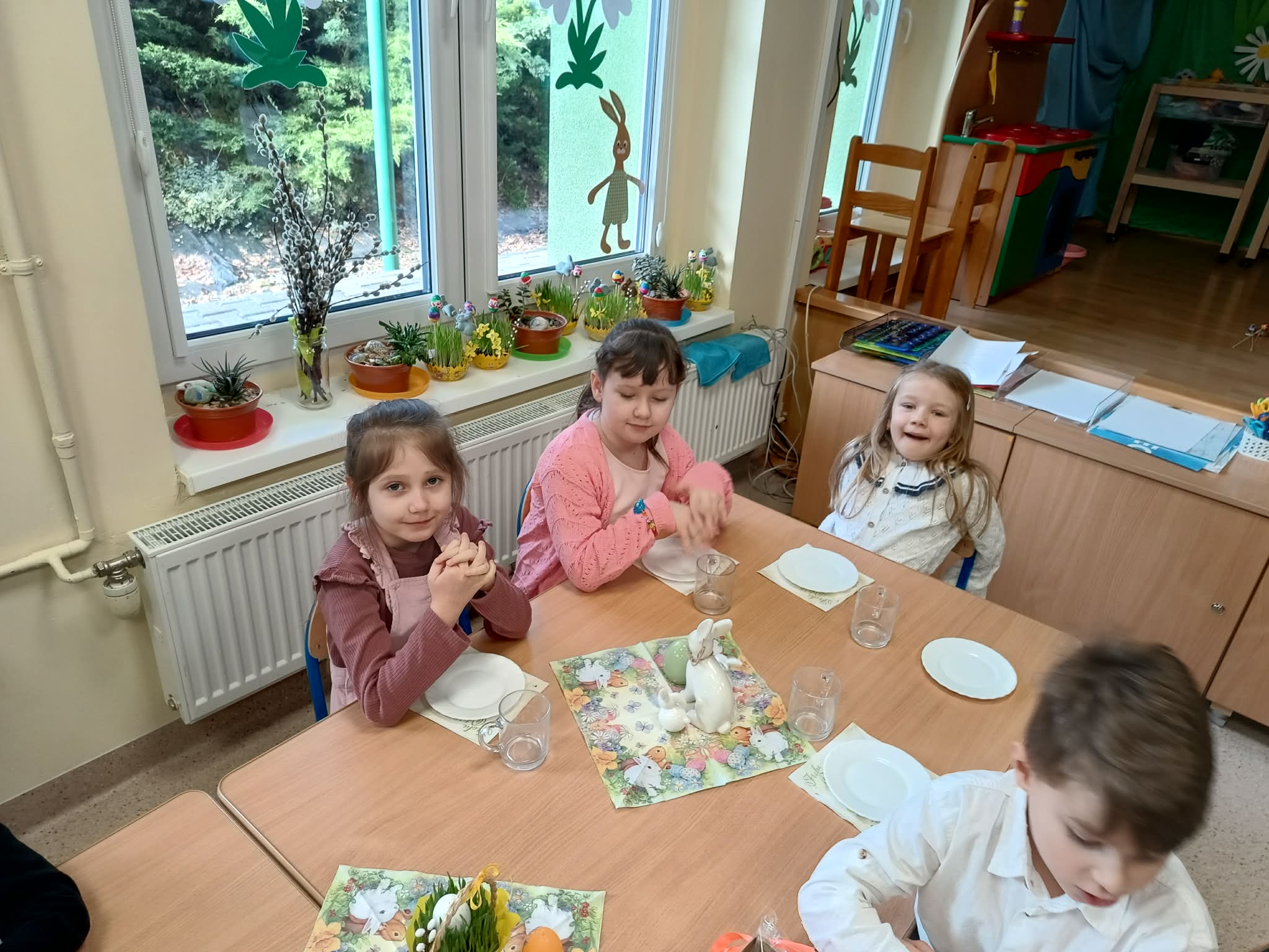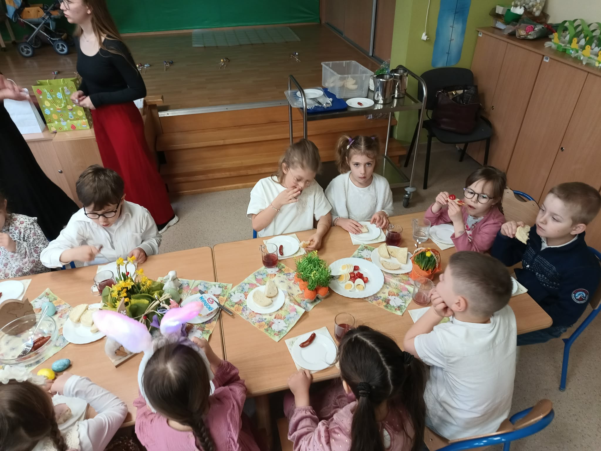 Śniadanie Wielkanocne utworzone przez d.jekel@przedszkolepobiedziska.pl | kwi 8, 2026 | Aktualności W środę, już tradycyjnie, zasiedliśmy do Śniadania Wielkanocnego. Po śniadaniu przykicali do nas goście i zostawili małe podarunki:)