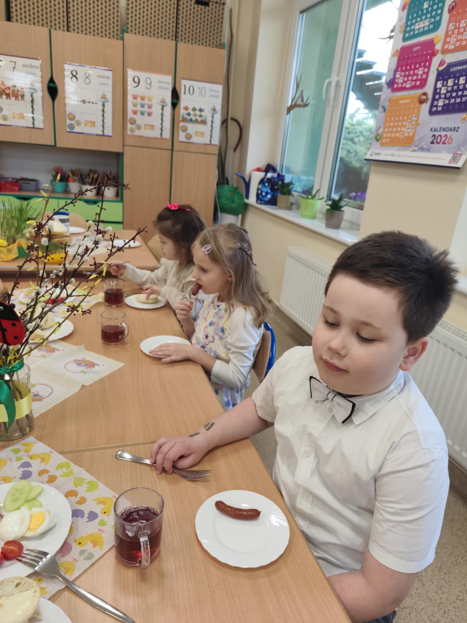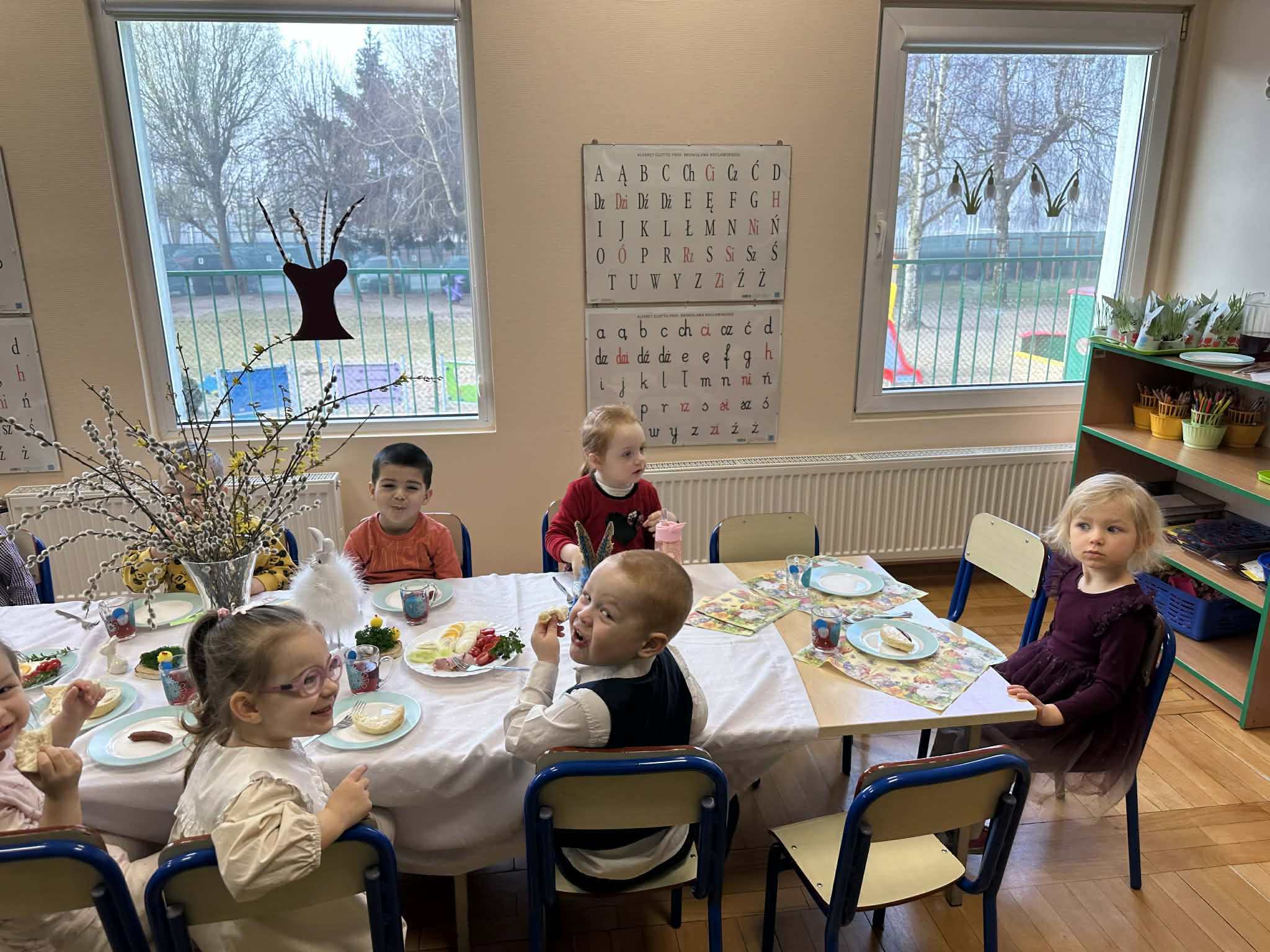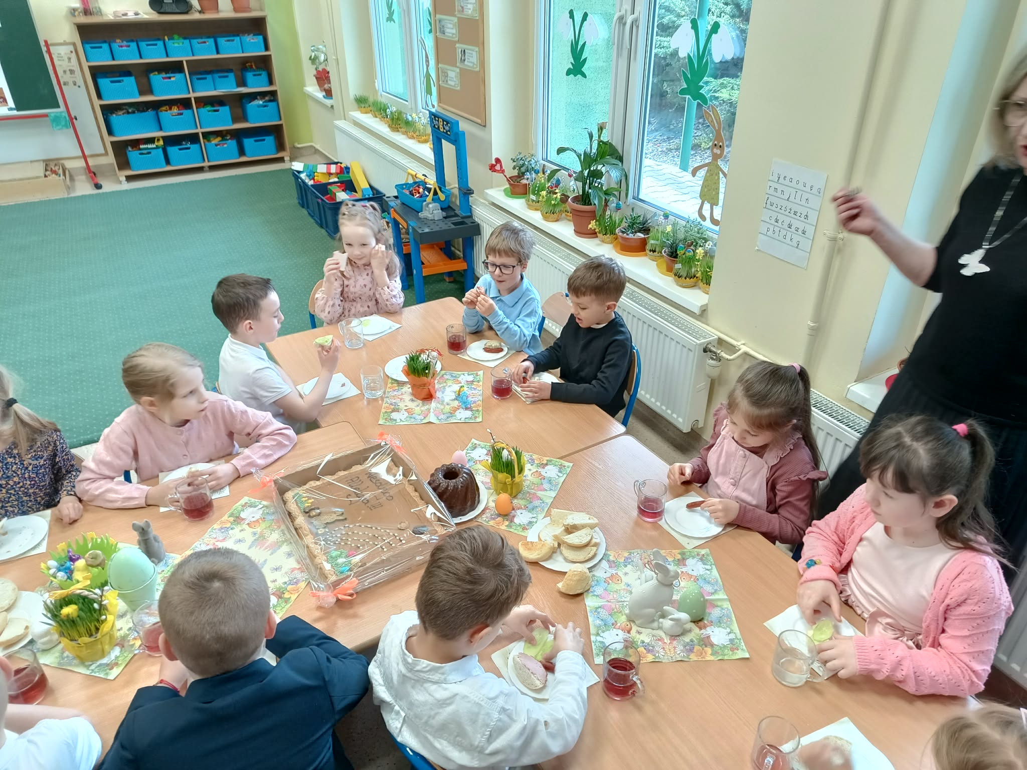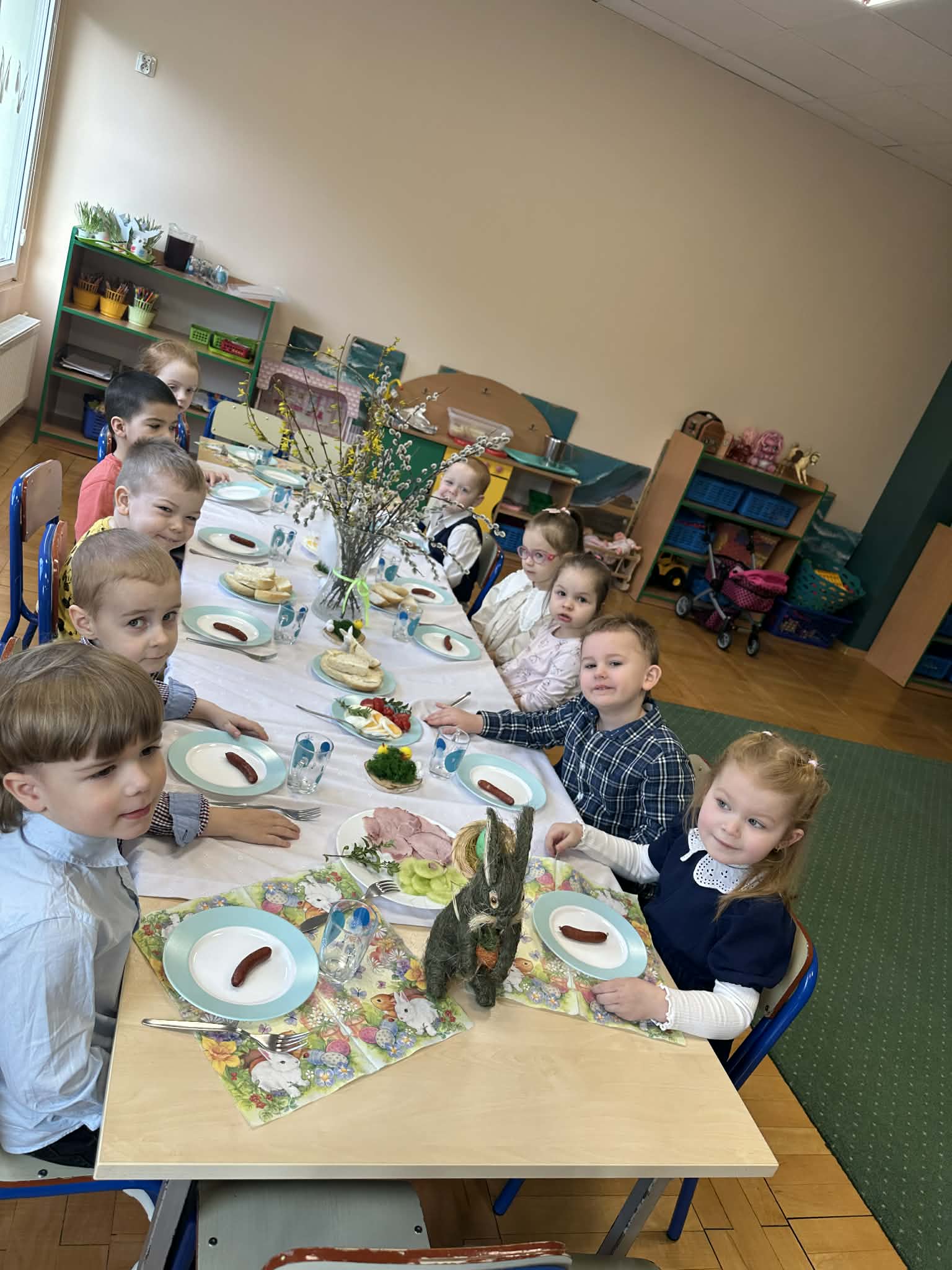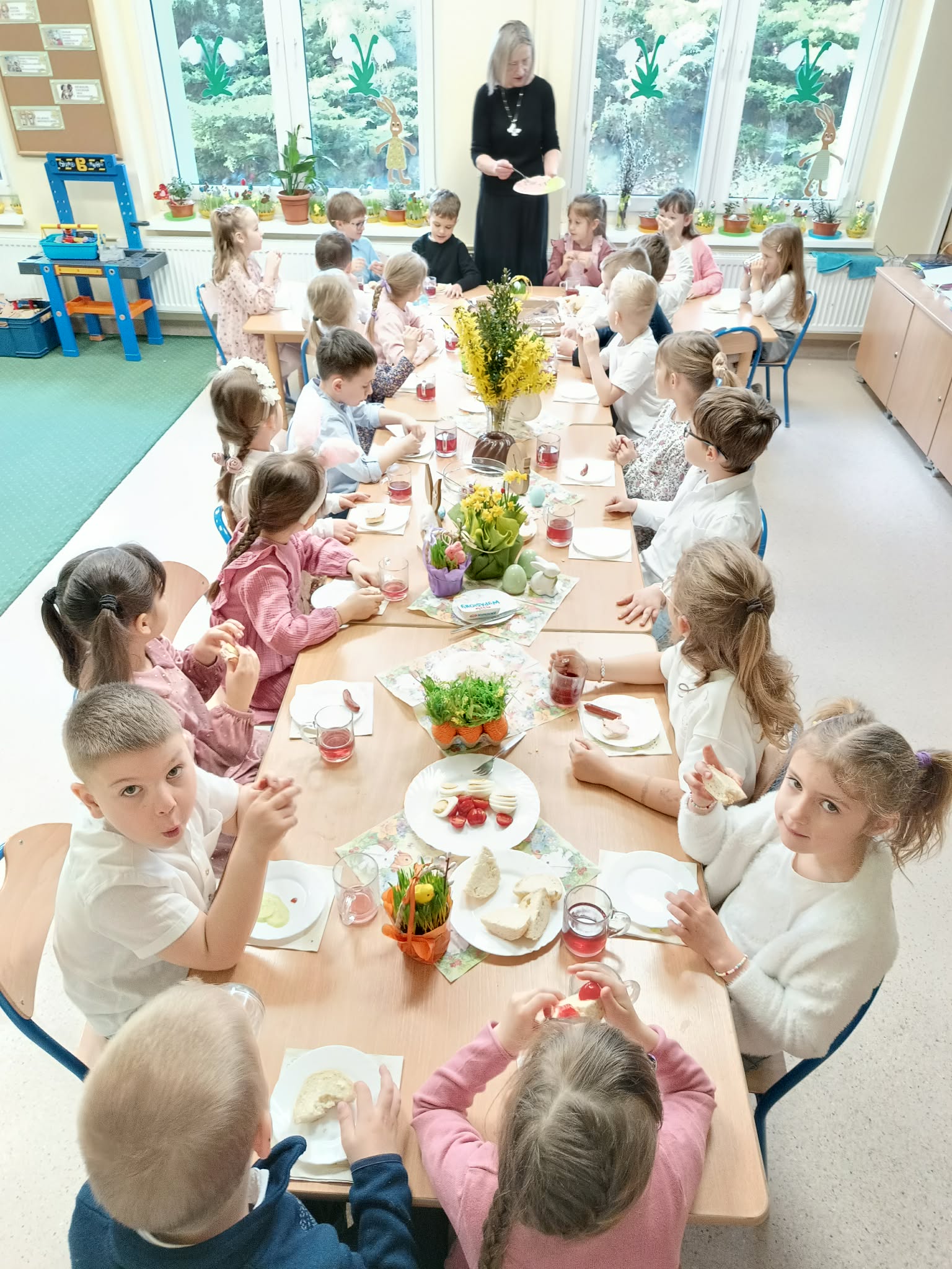 Śniadanie Wielkanocne utworzone przez d.jekel@przedszkolepobiedziska.pl | kwi 8, 2026 | Aktualności W środę, już tradycyjnie, zasiedliśmy do Śniadania Wielkanocnego. Po śniadaniu przykicali do nas goście i zostawili małe podarunki:)